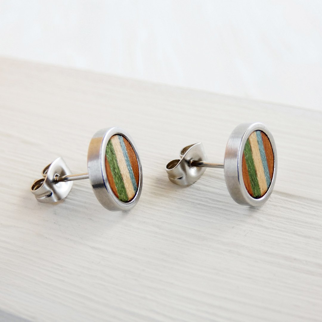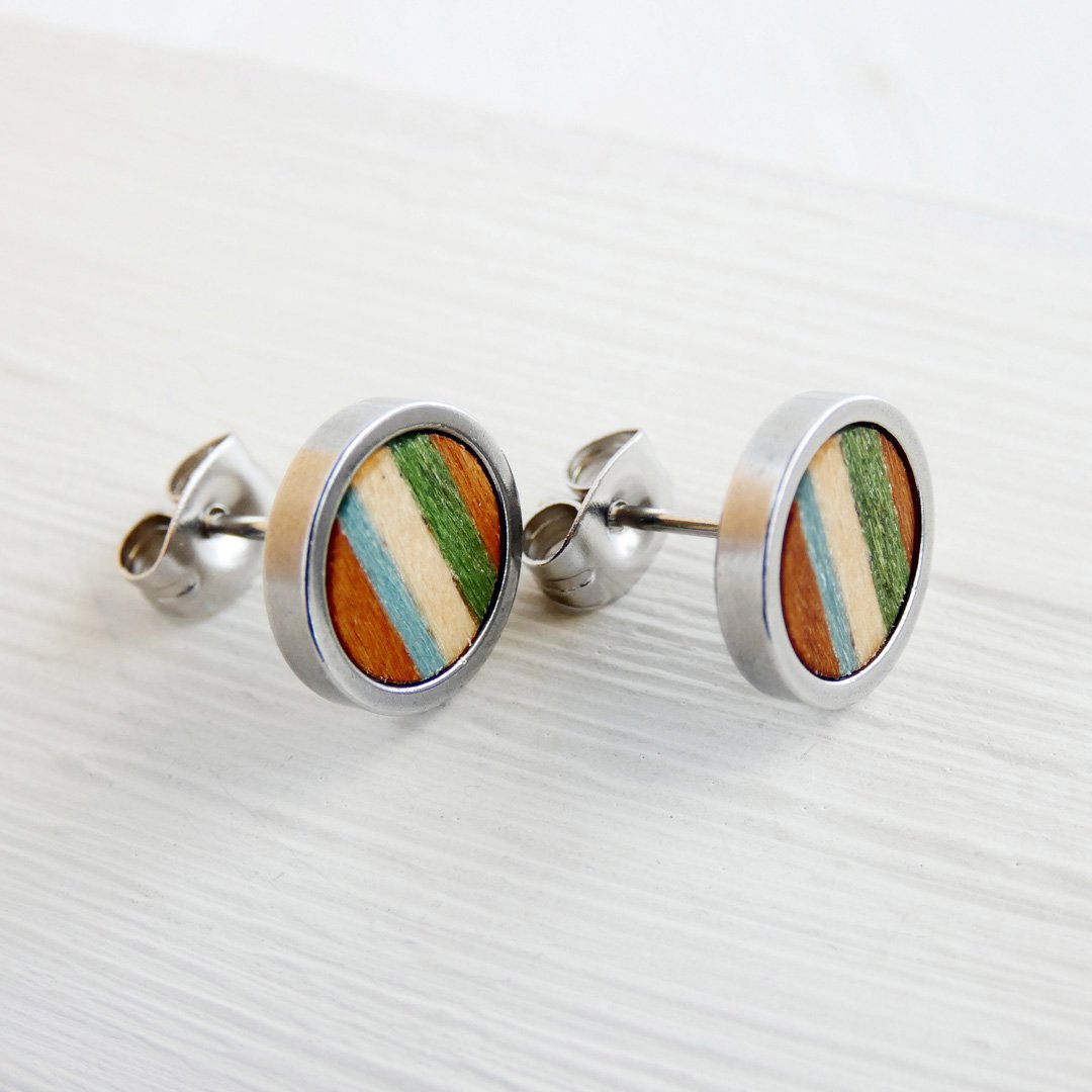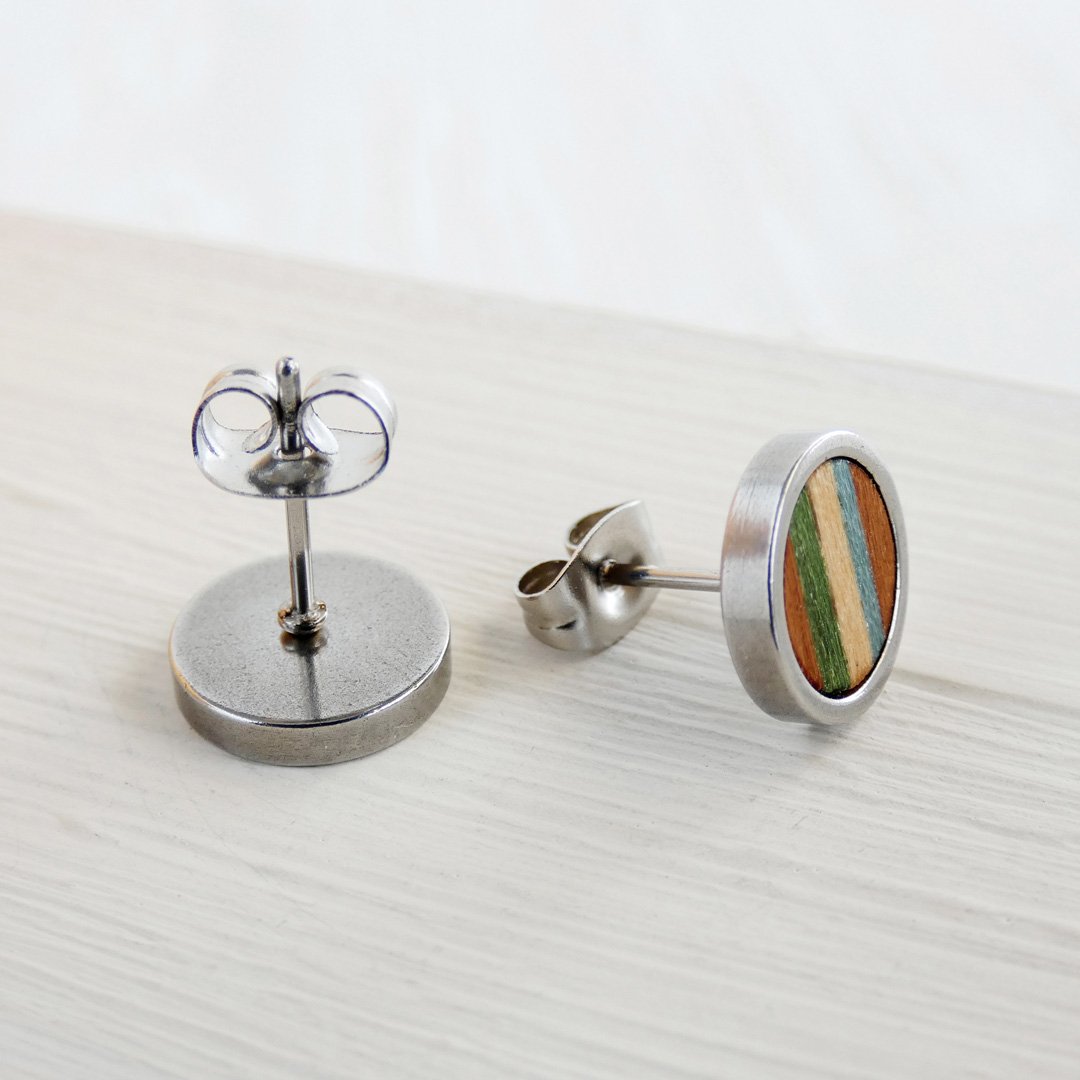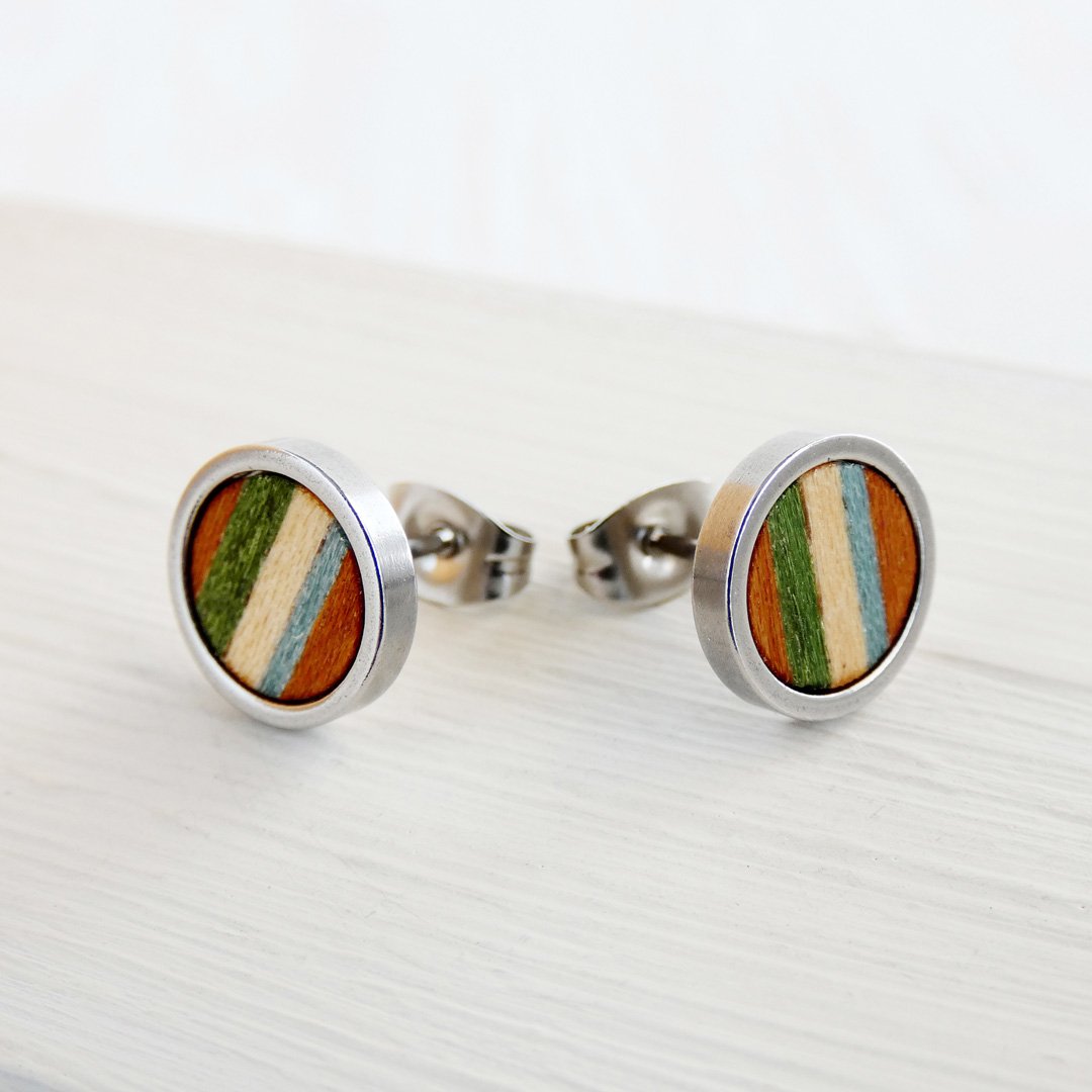Si te gusta el minimalismo pero odias lo aburrido, estos aretes de madera para hombre son perfectos para ti. Su discreto diseño a rayas que combina los tonos tierra con el verde y el azul los convierte en tu accesorio perfecto para el día adía. Son tan cómodos que olvidaras que los llevas puestos hasta que alguien te pregunte si tus aretes son de madera.