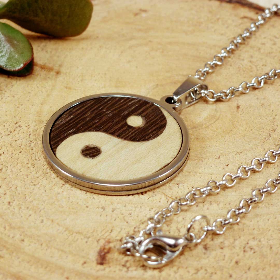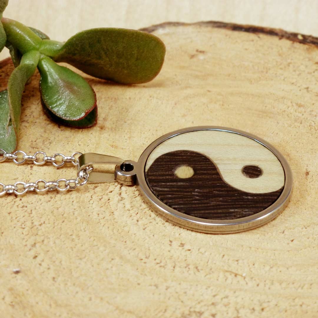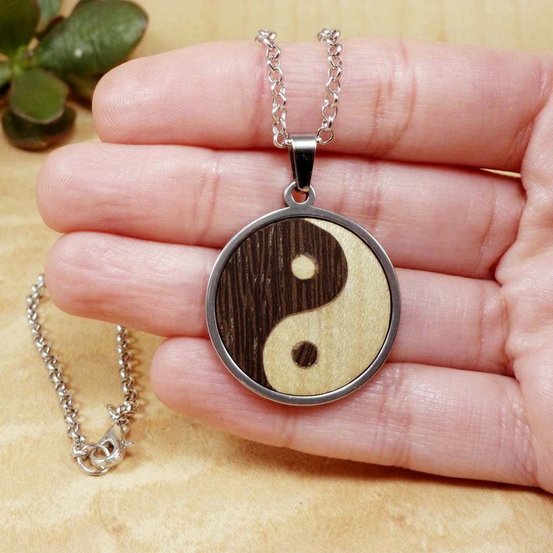 Descubre este colgante Yin Yang de madera y acero hecho a mano, elaborado con madera natural y acero inoxidable. ¡Un regalo perfecto para amantes del yoga y sus amigos!
