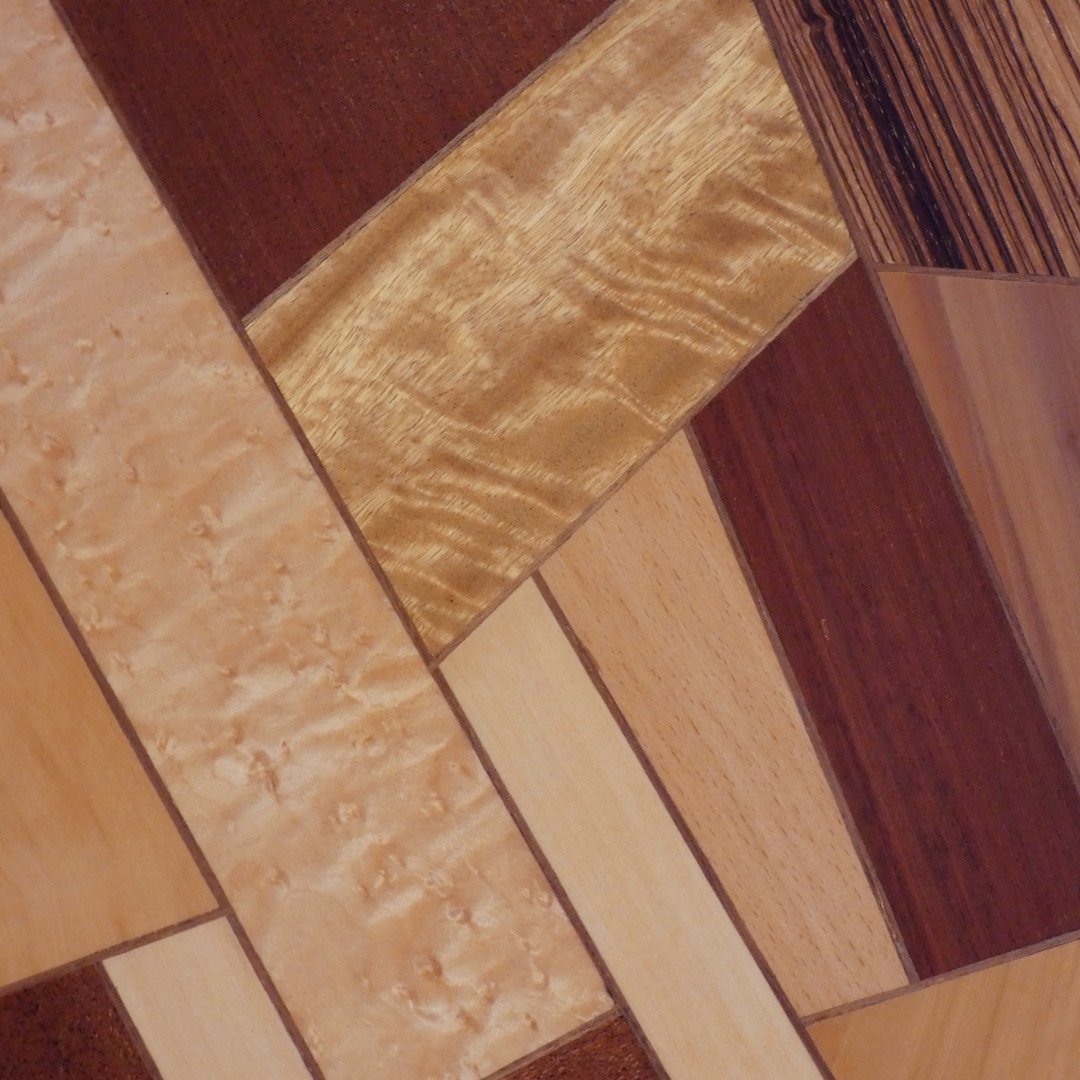 - Orgía de Texturas: Maderas rizadas que parece que se mueven, tendrás que pasar la mano para asegúrate que el cuadro es plano. El punteado hipnótico del erable y la fuerza lineal de las maderas exóticas. Es como un mapa del tesoro hecho a mano con maderas naturales.