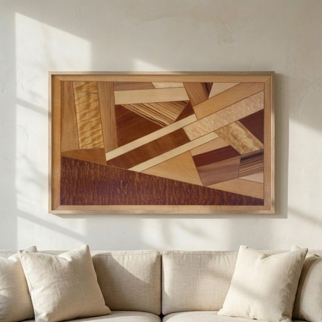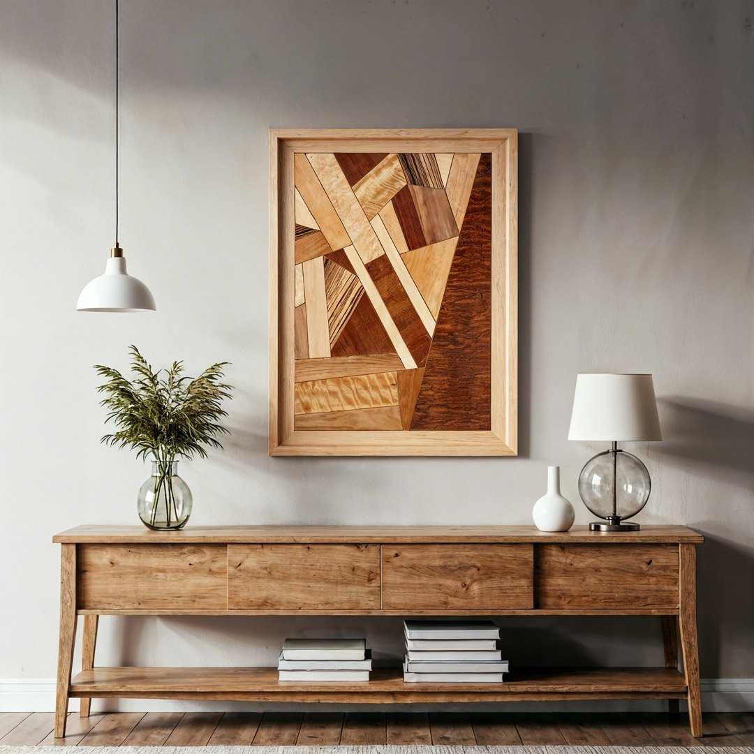 Si buscas el típico poster que combine con el sofá, te has equivocado de taller. Este cuadro abstracto grande será el alma de tu salón. He seleccionado las más espectaculares maderas naturales y las he obligado a convivir en un puzzle geométrico de 80 centímetros de altura. Aquí no hay nada de pintura: el color lo da la belleza de la naturaleza. Es un cuadro para los que saben que el verdadero lujo no brilla, sino que tiene veta, nudos y mucha actitud artesana.