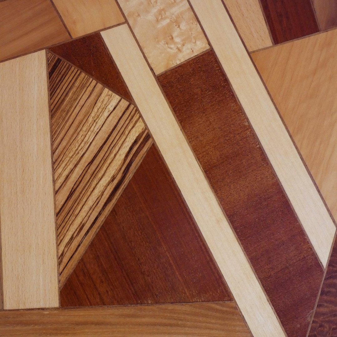 - Geometría Imposible: Ángulos locos que rompen la monotonía, líneas que se cruzan sin fin y una composición que te obliga a mirar dos veces o tres. Es marquetería moderna hecha con técnicas tradicionales (nada de laser).