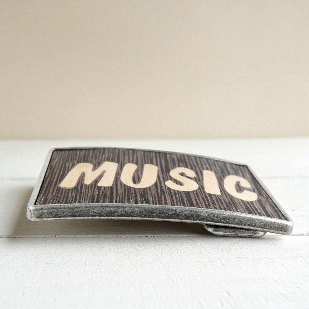Si eres de los que no conciben un viaje, un trabajo o una vida sin música, esta hebilla está diseñada para ti. Mi hebilla de madera para cinturón musical es un tributo artesanal a cada nota y cada acorde que te define. He cortado y ensamblado la palabra «MUSIC» letra a letra con la técnica de la marquetería tradicional, combinando la fuerza del Wengué con la luz del Sicomoro. Montada sobre una base metálica ergonómica, es una hebilla pensada para músicos y melómanos que buscan llevar su pasión en materiales nobles, con la ligereza y el carácter que solo la madera real puede ofrecer.